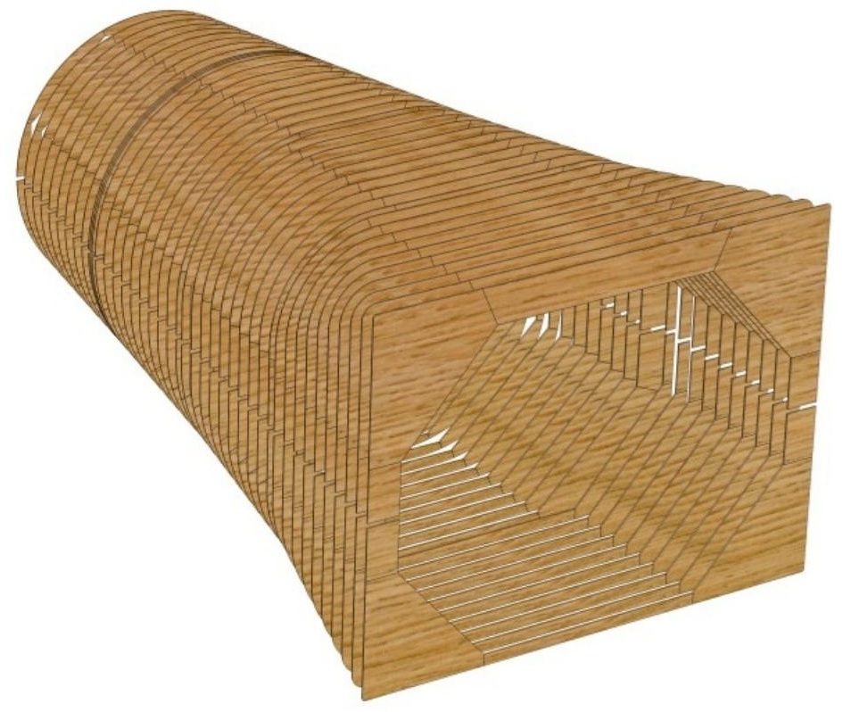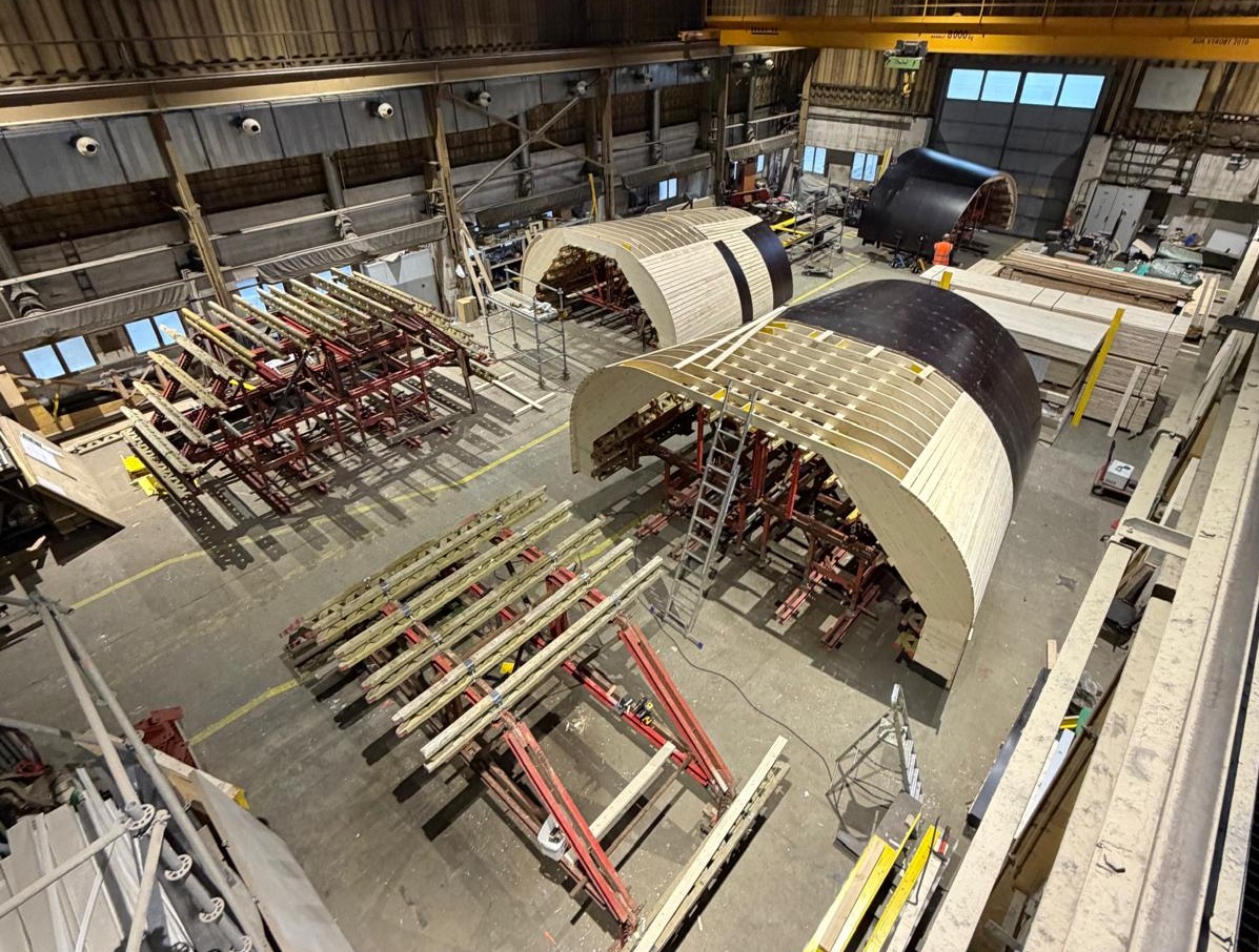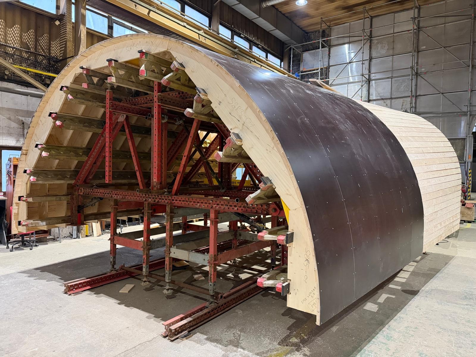 Ve výrobním areálu v Berouně byla provedena montáž nosné ocelové konstrukce jednotlivých sekcí ze systému Meccano, vyrobeny dřevěné ramenáty pomocí CNC technologie a následná kompletace každé sekce včetně opláštění. Výsledkem je bednění, které přesně odpovídá složité geometrii hydraulického profilu. Na stavbu se tak dopravily kompletně hotové bednicí sekce, které se osadily do výztuže. Takovéto technické řešení na klíč je přesné, rychlé a efektivní.